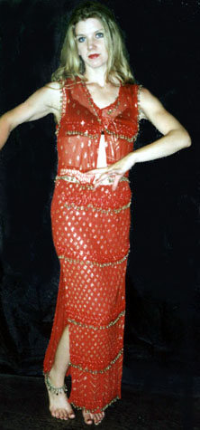 2-piece, vest and skirt made with soft Assuit fabric, which is a textile that has hammered metal woven into the fabric to make patterns. Delicately decorated with "noiseless" antique bells. They make jingling sound by touching each other.