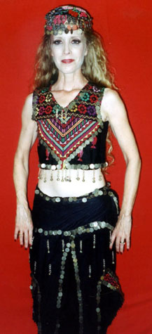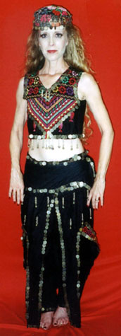 100% cotton 3-piece set has vest, belt with attached dagged skirt, and pants and is heavily hand embroidered and decorated with hundreds of antique coins and "noiseless" bells attached to small chains for greatest movement and security. Black only. Fits sizes 7-12