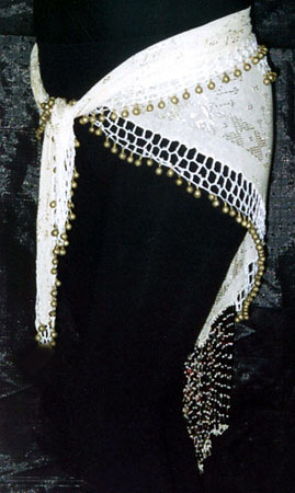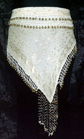 Assuit hipsash with "noiseless" bells. Has 6" glass beaded fringe to match fabric. Specify color choice: red, black, green, gray, purple, blue or cream.