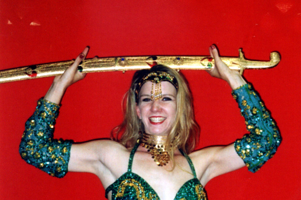 Sword in glass jewel decorated case. Gold or silver.
