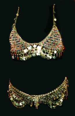 Bra decorated with pastel beads and coins. Fits size 32"- 38". Available silver or gold.