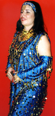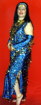 Polyester/lycra stretch beledi dress. Trimmed with glass beaded fringe and paillettes. Arm coverings included. Many colors available. Fits 7-14.