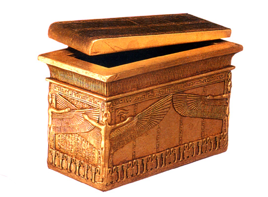 The sarcophagus of King Tutankhamun held his three coffins, one inside the other. Symbolism for magical purposes was an important feature of the Egyptian funerary regalia. The decoration of this sarcophagus is dominated by the four tutelary dieties carved in high relief. At each corner the graceful figures of the four goddesses: Selket, Isis, Nephthys, and Neith are depicted with wings outspread and arms circling the sarcophagus as if to keep away intruders, protecting the body of the king. Complete with heiroglyphics, this magnificent replica captures the fine detailed beauty of the original. Made of cultured marble covered with gold leaf. The interior is elegantly lined in burgundy felt.