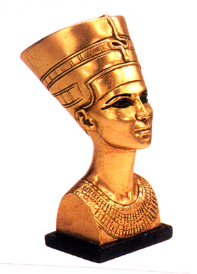 Nefertiti means "the beautiful one is come". She was the wife of King Ankhenanton, King Tutankhamun's father, and her daughter was Ankhesenanun, Tutankhamun's wife. The beauty of her face and the talent of the sculptor have made this bust universally known. Reproduced in cultured marble, hand gold leafed and detailed.