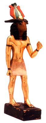 Khnum was an ancient god of the first cataract (waterfall) of the Nile, where on the island of Elephantine, the river was said to emerge from the subterranean ocean of Nun. Khnum was in some traditions the maker of earth, water, and the underworld. He created both gods and men: he fashioned men from clay on a potter's wheel and every child born is formed by his hands. Made of cultured marble, hand gold leafed and detailed.