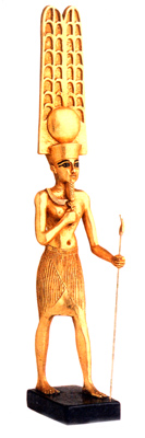 Amun-Ra, god of kings and king of gods, the oldest and longest venerated rulers of ancient Egypt. Amun, meaning "hidden" and Ra, meaning "light" translates to "The Hidden Light". The plumes on his head represent the air, which like him, is felt but not seen. As one of the promordial gods of creation, his name is found in the pyramid texts as far back as the 5th Dynasty (2494-2345 B.C.). Made of cultured marble, hand gold leafed and detailed.