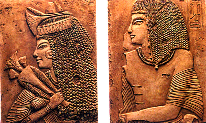 This husband and wife were immortalized on their tomb wall in limestone relief. Note the intricate hair stylization. Plaques are of cast stone, hand gold leafed and detailed.