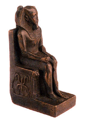 Khephren built the second Pyramid. The god Horus, as a falcon, is perched behind him. Made of bronze and richly patinated.